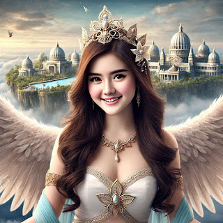 Foto wanita indonesia sedang melayang diatas awan, latar istana penyihir megah, wajah cantik dan kulit putih bersih, payudara besar dan pantat besar, memakai bikini tipis dan transparan, memakai sayap, memakai perhiasan intan dan berlian, foto dari kepala sampai lutut, foto manusia realistis, memakai mahkota ukuran kecil dikepala...